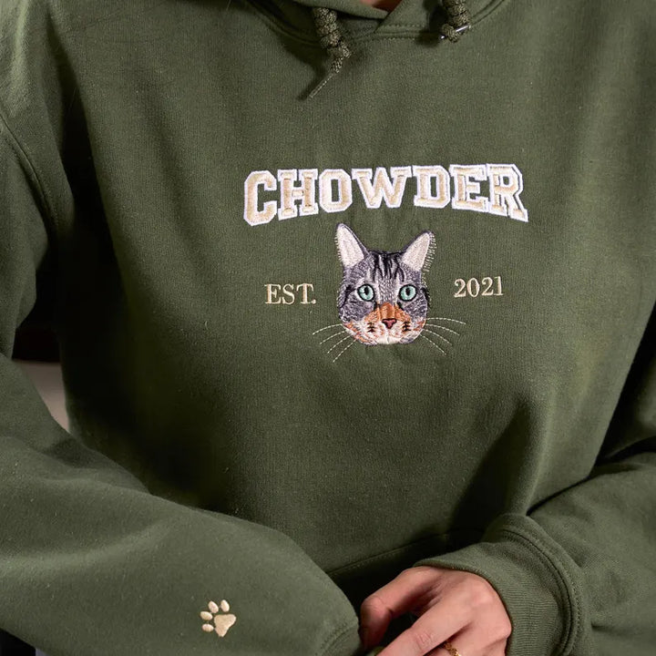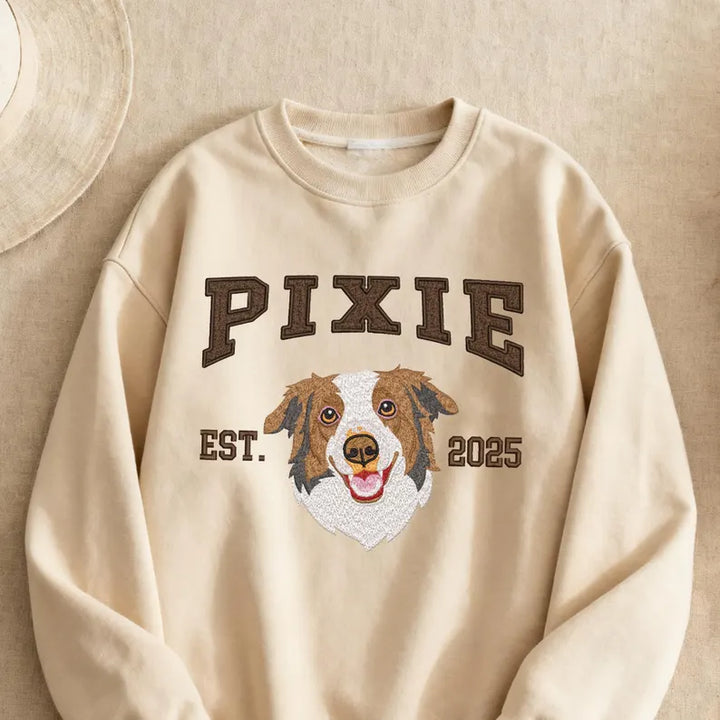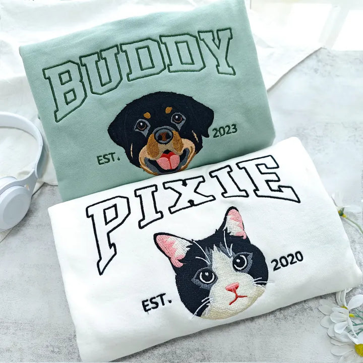 Our Custom Full-Color Pet Portrait Embroidered Sweatshirt transforms your favorite photo into a vibrant, detailed embroidery — capturing every expression, shade, and whisker.